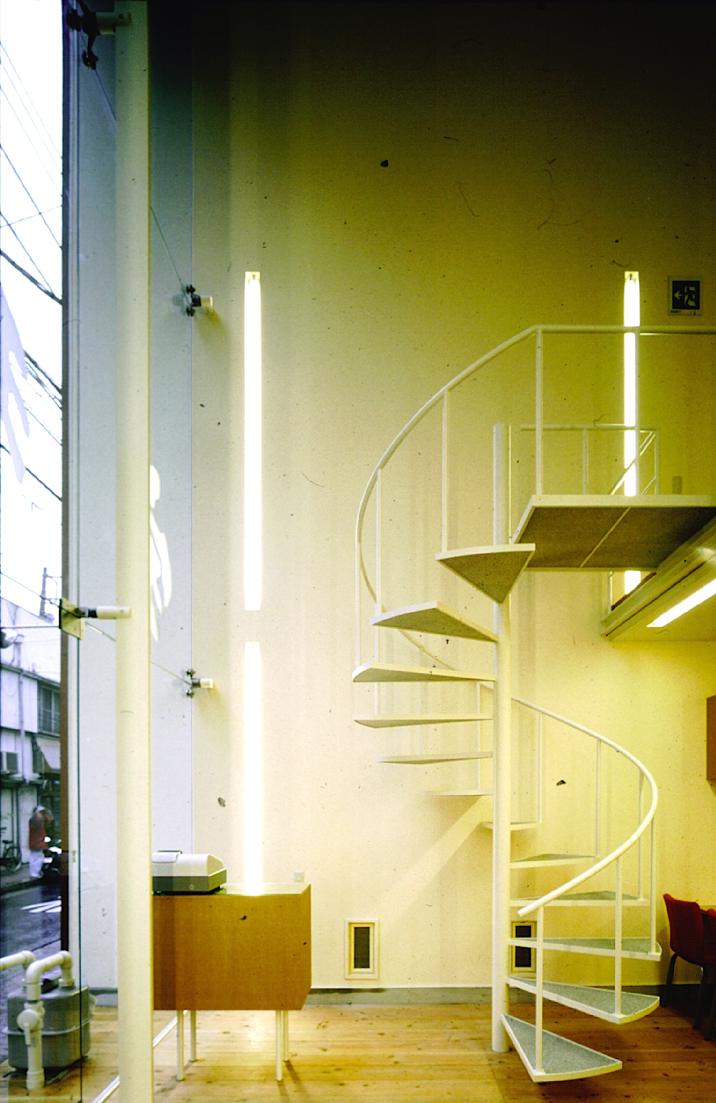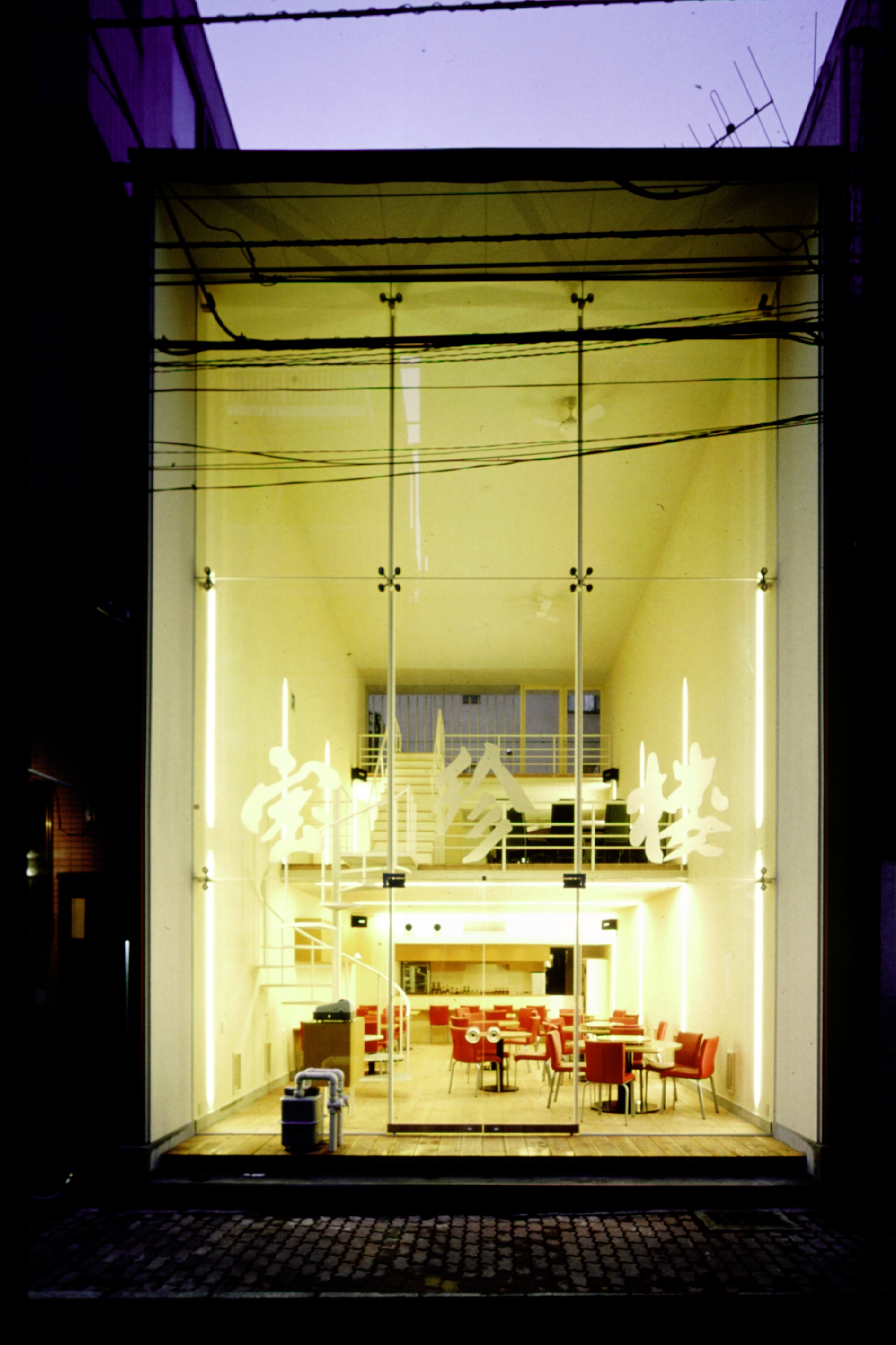 細くて頼り無い外観のフレームとは裏腹に、ダイナミックな空間を内包させ、薄い筒状の建物であることが、道路を歩く人からも良く見えます。敷地の形状、施主の要望、素直に組立ててきたつもりでしたが、汎用性の高い、通常とはすこし違う建築が商店街の一角に出現しました。すこしだけ違うことの連続で辿り着いた建築は、きわめてシンプルで薄いフレームの連続で成立していますが、建築主体より都市のヴォイドの様にも見えます。